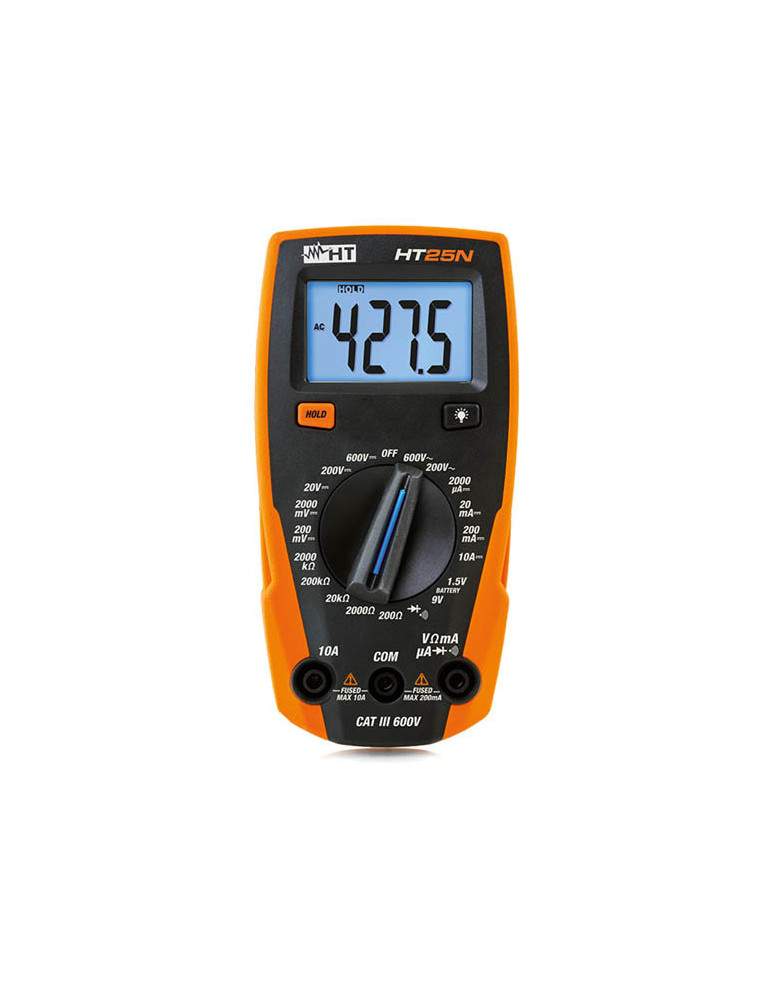 HT25N è un multimetro digitale compatto in grado di eseguire principalmente misure di Tensione AC/DC fino a 600V e Corrente DCfino a 10A con funzioni complementari di Resistenza, Test Continuità, Prova Diodi e Test batterie alcaline 9V e 1.5V.É stato progettato in accordo con la normativa di sicurezza IEC/EN61010-1 con protezione in doppio isolamento in CAT III 600V. Sono dotati di un ampio display LCD retroilluminato e ogni funzione può essere selezionata tramite l'apposito commutatore. Ulteriore funzione prevista è la Data HOLD per il mantenimento dei valori a display.