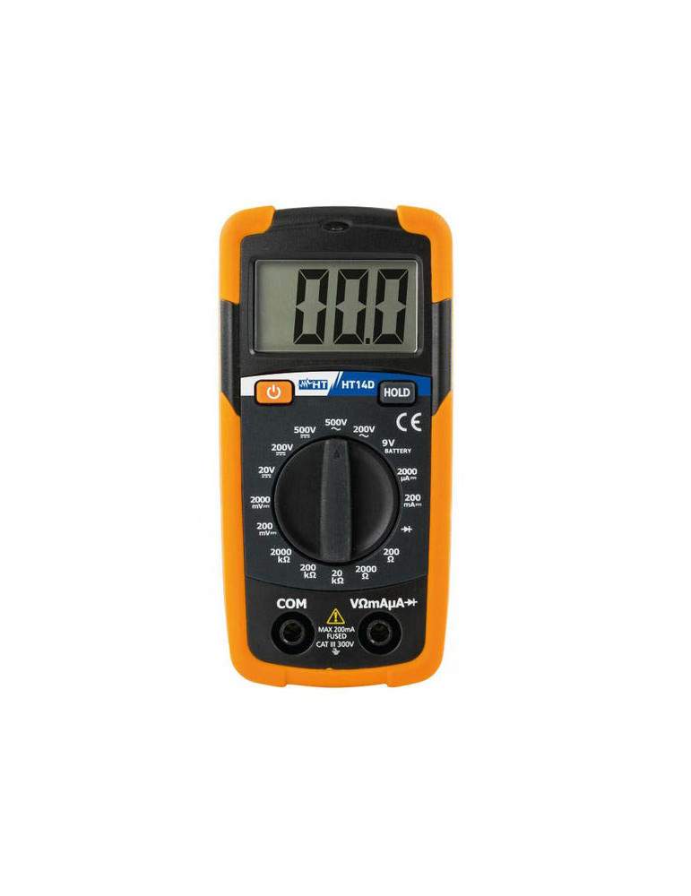E' un multimetro digitale compatto in grado di eseguire principalmente misure di Tensione AC/DC fino a 500V e corrente DC fino a 200mA con funzioni complementari di Resistenza, Prova Diodi e Test batterie alcaline 9V.Ideale per effettuare misure di Tensione AC/DC, Resistenza, Test Continuità, Frequenza, Duty Cycle, Prova Diodi e Capacità.E' dotato di un ampio display LCD e ogni funzione può essere selezionata tramite un apposito commutatore. Ulteriore funzione prevista è la Data HOLD per il mantenimento dei valori a display. Il modello HT14D è un multimetro digitale ultracompatto di moderna concezione e di semplice utilizzo grazie ai puntali di misura integrati.E' stato progettato in accordo con la normativa di sicurezza IEC/EN61010-1 con protezione in doppio isolamento in CAT III 300V.