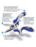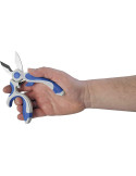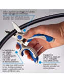 Forbice X-pro Evo con innovativo design con linee e volumi che garantiscono un'ergonomia eccellente. Sono adatte a mani di dimensioni diverse grazie alla particolare forma ad occhiello aperto della leva inferiore. Il corpo è in materiale bi-componente che alterna materiale soft touch a superficie antiscivolo per una presa comoda e sicura, che consente di tagliare con minor sforzo. Il manico è robusto, le lame in acciaio lo percorrono in tutta la sua lunghezza. Il sistema di apertura a molla consente di aprire le forbici senza sforzo per una efficace operazione di spelatura e taglio dei cavi. Il dispositivo di blocco lame si sgancia con un solo gesto. Queste forbici hanno lame con microdentellatura antislittamento del taglio e geometria delle lame a profilo variabile per tranciare e sguainare cavi in rame e alluminio sino a 50 mm².