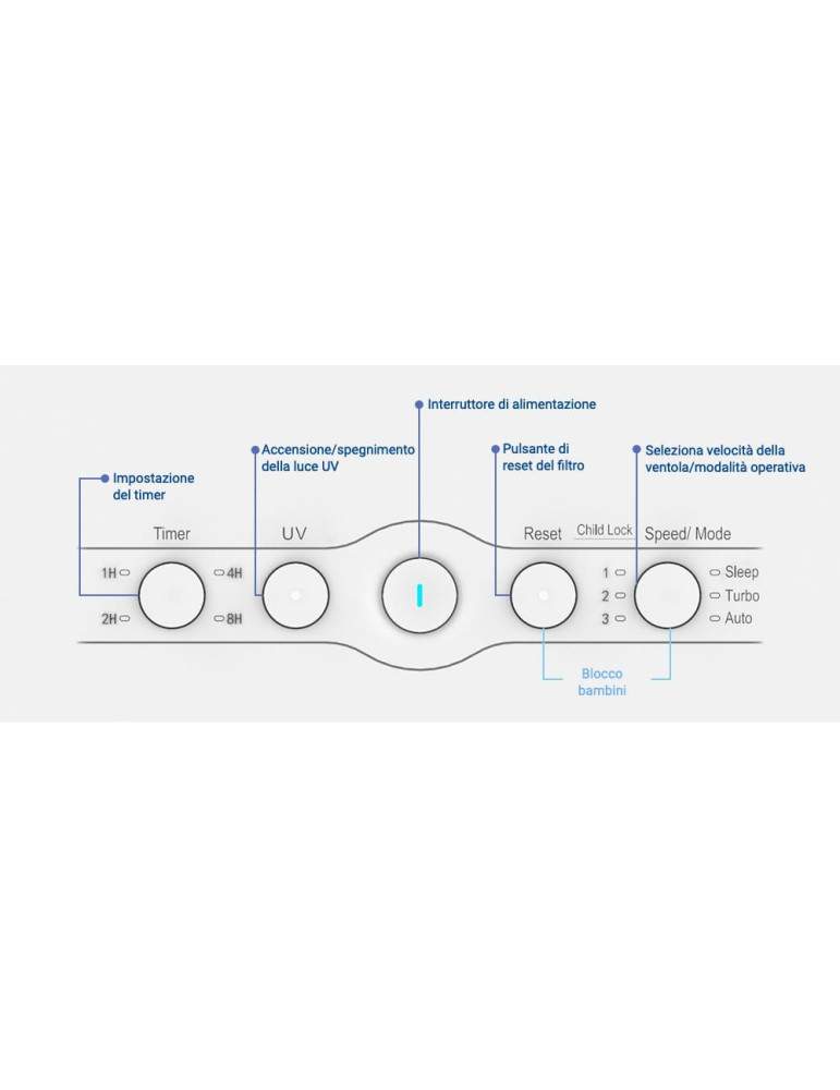 CARATTERISTICHE GENERALI: PURIFICAZIONE: CADR (particelle): 350 m³/h Rumore max: 66 dB (A) Area applicabile max: 42 m² FILTRI: Filtro principale: Filtro in spugna Filtro HEPA: Filtro HEPA H11 Filtro al carbone attivo: Filtro al carbone attivo di guscio di cocco FUNZIONI: Sterilizzazione con luce UV-C: Supportata Sterilizzazione dell’aria con ioni negativi: Supportata Impostazioni velocità ventola: Velocità da 1 a 3 Modalità operative: Supporta le modalità Notte, Turbo e Automatica Visualizzazione qualità dell’aria PM2,5: Supporta la visualizzazione della qualità dell’aria Visualizzazione sostituzione filtro: Supportata Blocco bambini: Supportata Modalità timer: Supportata (1 h, 2 h, 4 h, 8 h) Sensore di polvere: Supportata Wi-Fi: No DATI TECNICI: Alimentazione: 220-240 V / 50 Hz Assorbimento: Max 80 W Dimensioni del prodotto (L×P×A): 374×215×594 mm Peso netto: 6,88 kg DIMENSIONI DEL PRODOTTO (AxLxP): Filtro principale: 404 × 341 × 5 mm Filtro HEPA: 404 × 341 × 26 mm Filtro al carbone attivo: 402 × 336 × 10 mm Peso netto: 0,84 kg Peso lordo: 1,14 kg