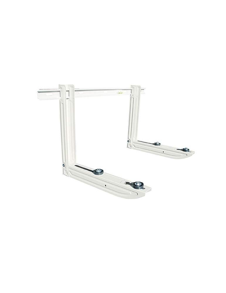 Staffa per unità esterna condizionatori, costruita in lamiera elettrozincata e verniciata con polvere poliestere resistente agli agenti atmosferici. La barra di fissaggio a muro dotata di dentini, consente l'ancoraggio e la regolazione della distanza tra bracci reggimensola, senza che questi possano scorrere durante la fase di installazione. I supporti sono predisposti al montaggio della bacinella raccolta condensa. La silenziosità è ottenuta da appositi antivibranti sulle mensole e piedini regolabili snodati posti sul retro del braccio che eliminano tutte le vibrazioni trasmesse dalla macchina. La staffa è collaudata e certificata con un peso statico pari a 1,5 volte quello dichiarato. Disponibili in singola confezione completa di: piedini regolabili e snodati posteriori, antivibranti, viteria, tasselli di fissaggio a muro.