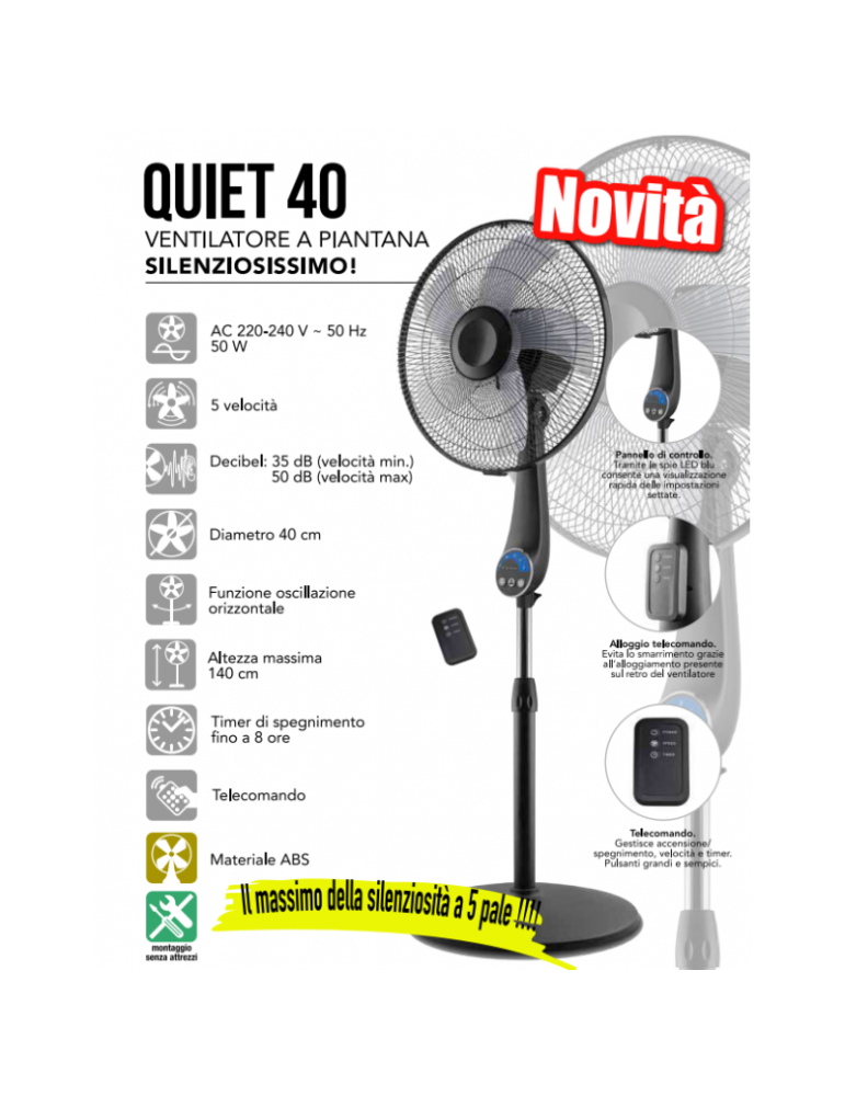 Ventilatore Da Terra A Piantana QUIET 40 Nero Silenzioso Con Telecomando CFG - EV074
