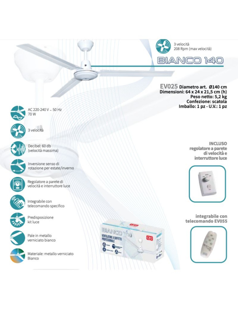 Ventilatore A Soffitto BIANCO 140 3 Pale Metallo Professionale 140cm CFG - EV025