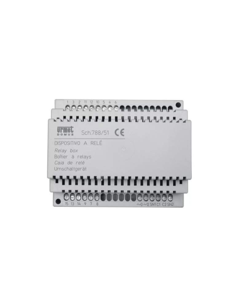 Il dispositivo può gestire 2 posti esterni AudioVideo o posto esterno AudioVideo più servizio intercomunicante in commutazione automatica. E' dotato di 5 scambi che garantiscono il segreto di conversazione per ogni singolo servizio. Sostituisce i relè UTD 9332/1, UTD 788/1, UTD 4340/11. Dimensioni LxAxP 108 x 90 x 55 mm Moduli DIN 6 e Alimentazione 12Vac. Assorbimento 0,18A 12Vac e Portata contatto relè 7-8-9 5A 12Vac, Portata contatti relè 1A 12Vac.
