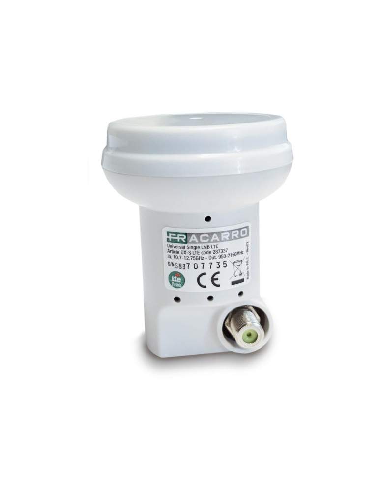 Convertitore universale che garantisce un’ottima ricezione del segnale e che si adatta a tutte le esigenze, dal semplice impianto singolo ai pù complessi impianti multiutenza e centralizzati. UX-S LTE , frequenze di ingresso banda bassa 10,7-11,7 ghz, banda alta 11,7 12,75 ghz. Frequenza di uscita banda bassa 950-1950 mhz, banda alta 1100-2150 mhz. Numero uscite 1. Consumo -70 ma. Guadagno -50 -62 db. Temperatura -40 +60°C.