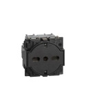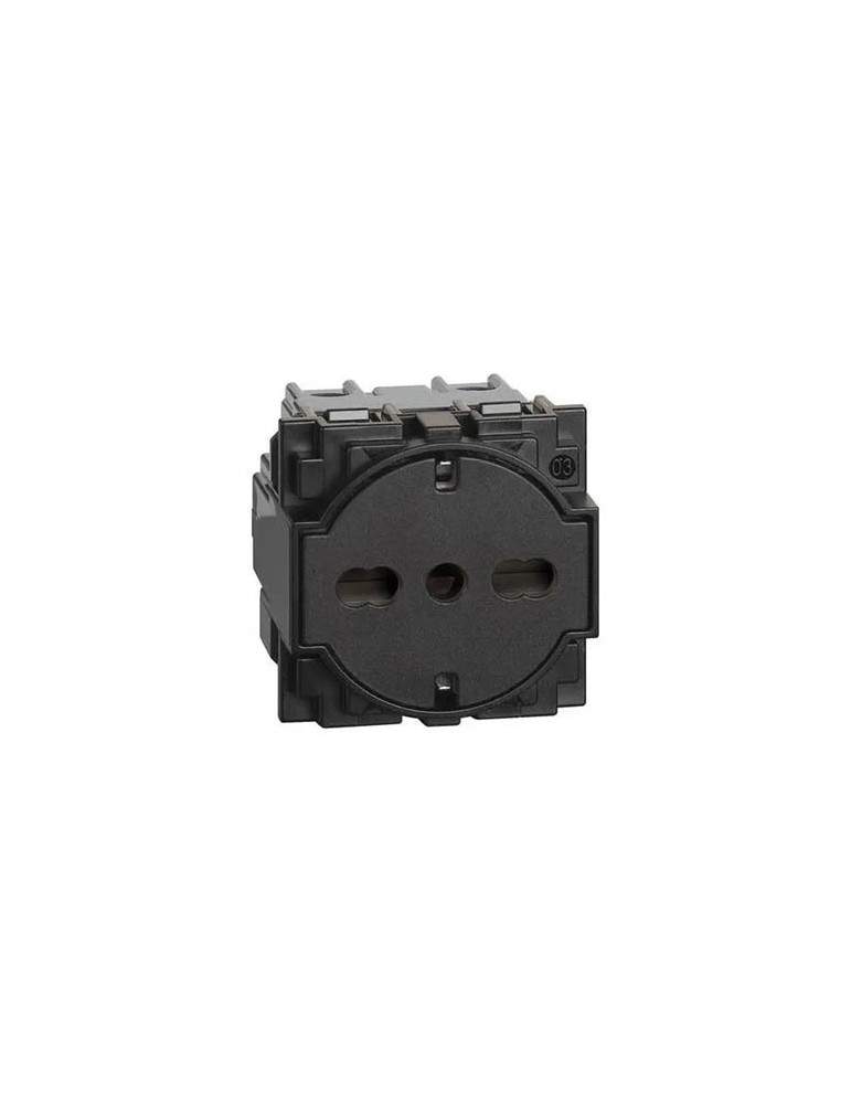 Presa flat standard tedesco e italiano. La superficie della presa, quando la spina viene inserita, scivola all’interno del pozzetto; ritorna in posizione iniziale quando la spina viene estratta. Presa 2 P+T 16 A 250 Va.c.; interasse 19 mm e 26 mm in configurazione bipasso; alveoli protetti; contatti laterali di terra per spine standard tedesco. Adatta per: spine standard Italia 2 P e 2 P+T 10/16 A, spine standard tedesco 2 P+T16 A . 2 moduli, Nero.