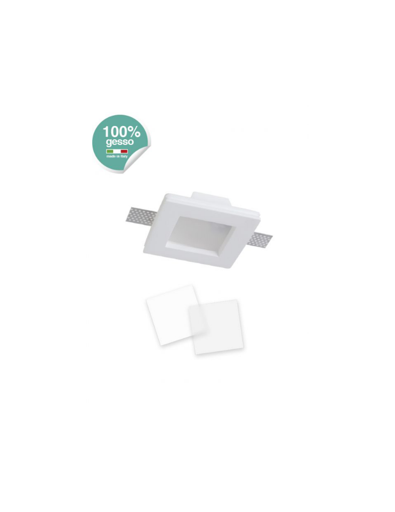 Faretto ad in casso completamente in gesso 100% , colore bianco. Adatto ad essere installato al soffitto. Portalampada GU10 compreso e 2 schermi in pvc bianco latte e satinato opaco, intercambiabili. IP20. Forma quadrata. Dimensioni 120 × 30 mm; foro 122x122mm. La confezione è priva di lampadina.