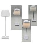 Lampada LED da tavolo ricaricabile con intensità luminosa regolabile e luce calda, fredda o naturale selezionabile. IP44 contro spruzzi di acqua e polvere.