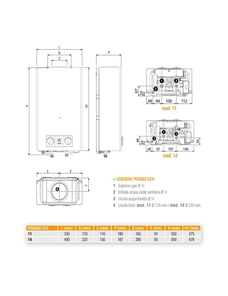 Il Ferrolli PEGASO ECO 14 METANO GCA1MKAA è uno scaldacqua a gas a camera aperta e tiraggio naturale con emissione di fumi di tipo LOW NOx - Classe 6.