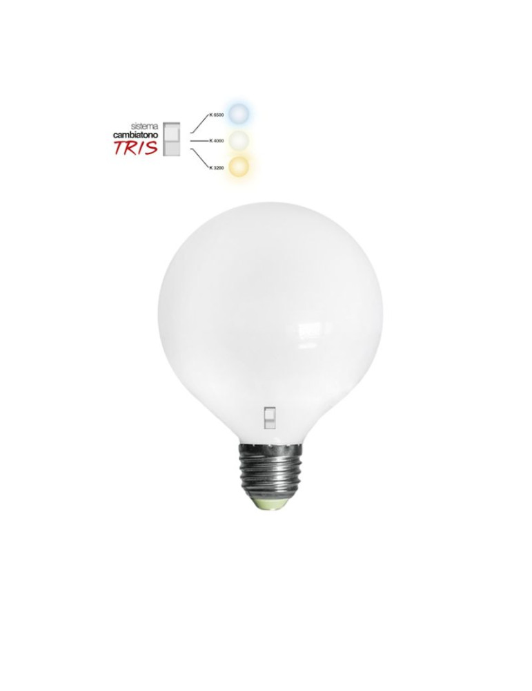 Lampadina led globo TRIS E27 18W con attacco E27. Sistema TRIS con tastino cambiatono integrato. Equivalente a (W) 40. Dimensioni 120×152 mm; Watt 18. Lumen 2.000. Classe energetica A++ e Temperatura K6500 – K4000 – K3200 . Grado di protezione IP20. Autonomia 50.000 ore; Angolo 300°. Certificazioni CE Rohs.