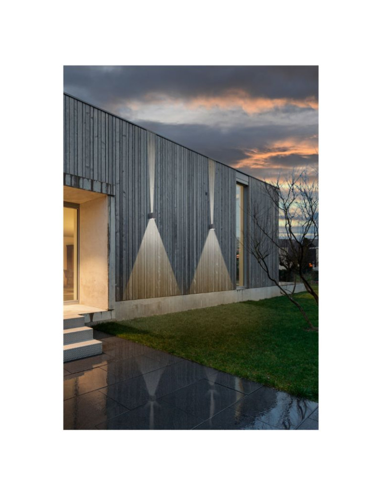 Applique da parete in alluminio per interni ed esterni _ Moduli LED integrati 2x10W (doppia emissione) _ Doppio fascio regolabile 0° - 90° senza l'uso di attrezzi _ CCT selezionabile. Potenza Watt 20 Lumen 1180 Kelvin 3000-4000-5500 Classe Energetica Fascio 2x90 Volt 220. Ip65