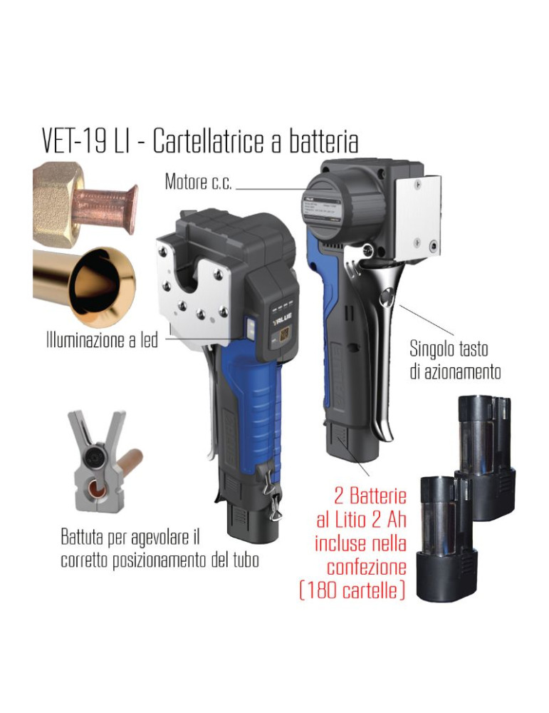 Cartellatrice elettrica a batteria (litio) - esegue cartelle precise e ben delineate su tubazioni in pollici con diametro 1/4", 3/8", 1/2", 5/8" e 3/4", grazie alle dime fornite in dotazione e due batterie al litio 2 Ah 7,4 V fornite in dotazione, sufficienti per una lavorazione di ben 90+90 cartelle. Importante: Il gruppo GeneralGas-SaldoGas è distributore esclusivo per l'Italia dei prodotti VALUE. Realizza cartelle di elevata qualità in pochi secondi ed ha una capacità produttiva di circa 90 lavorazioni all’ora, con batteria al litio carica. Il cono ad eccentrico, design esclusivo, rende la flangia liscia ed uniforme. La cartellatrice è dotata di luce led, per l'illuminazione diretta dell’area di lavoro. Fornita in una pratica valigetta in materiale plastico, che alloggia la cartellatrice, la batteria, un caricabatteria e cinque morsetti (dime). N° 5 dime per tubi diametro 1/4″, 3/8″, 1/2″, 5/8″, 3/4″ incluse nella confezione. CONTIENE 2 BATTERIE