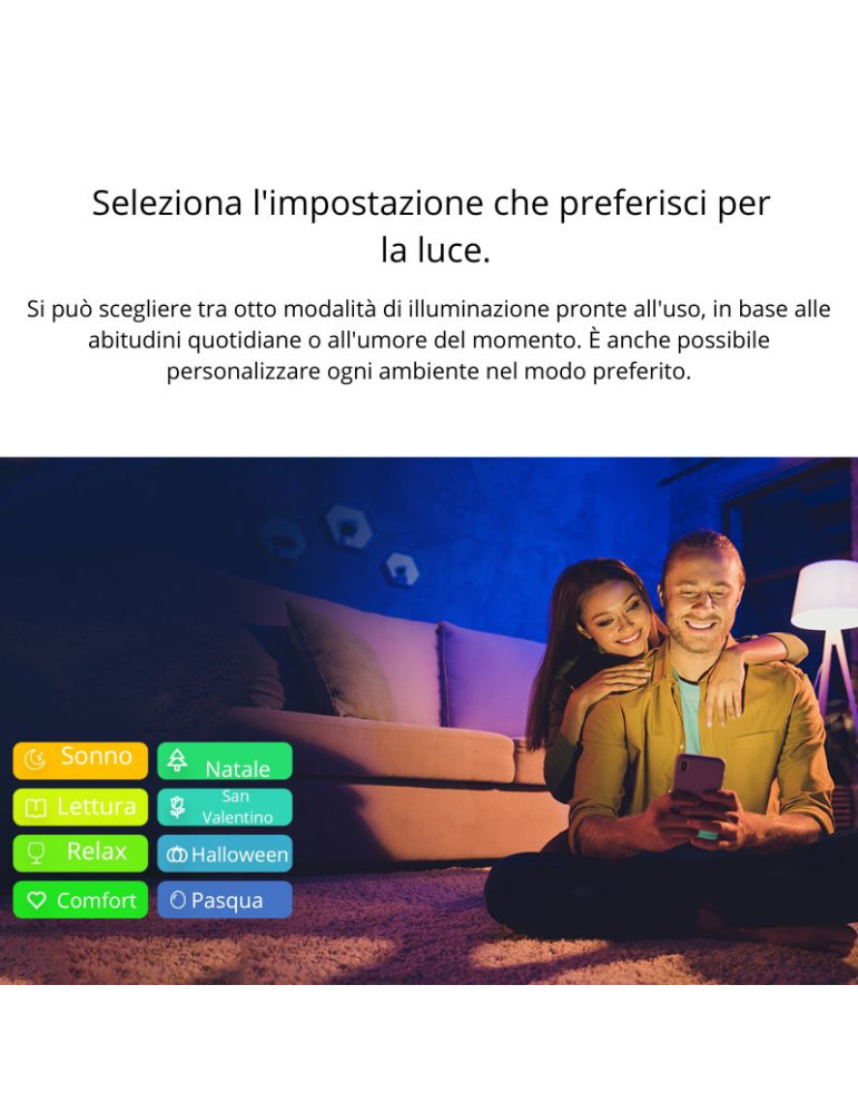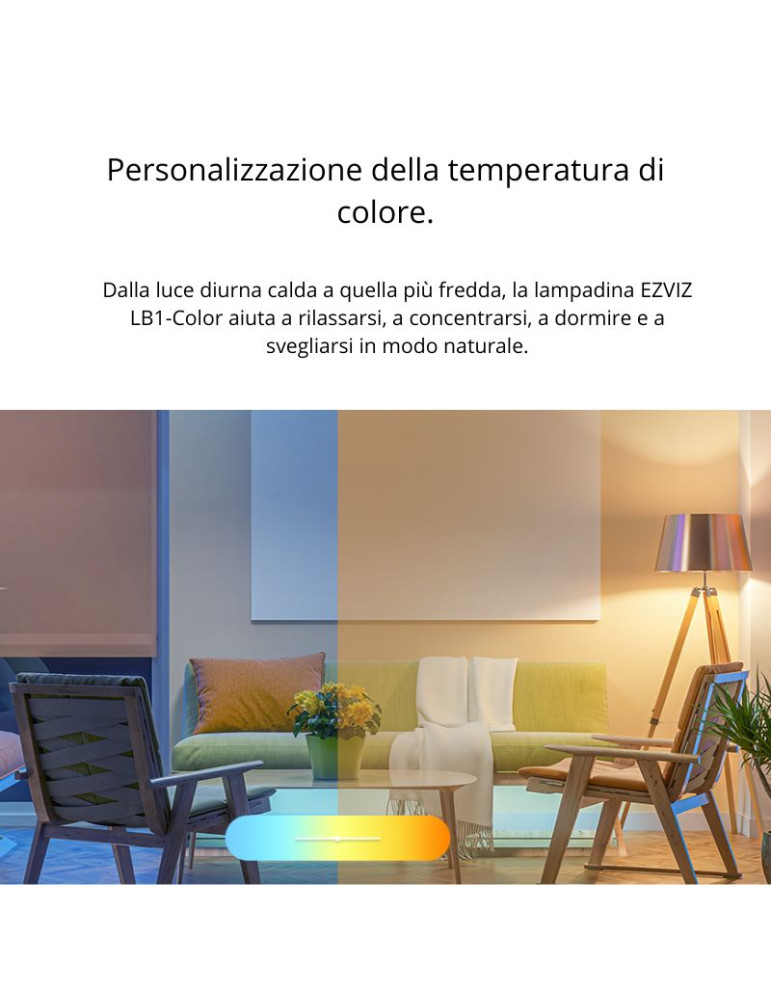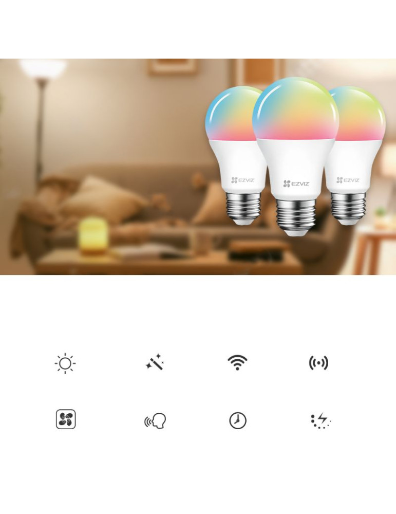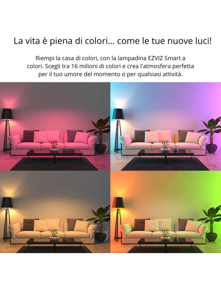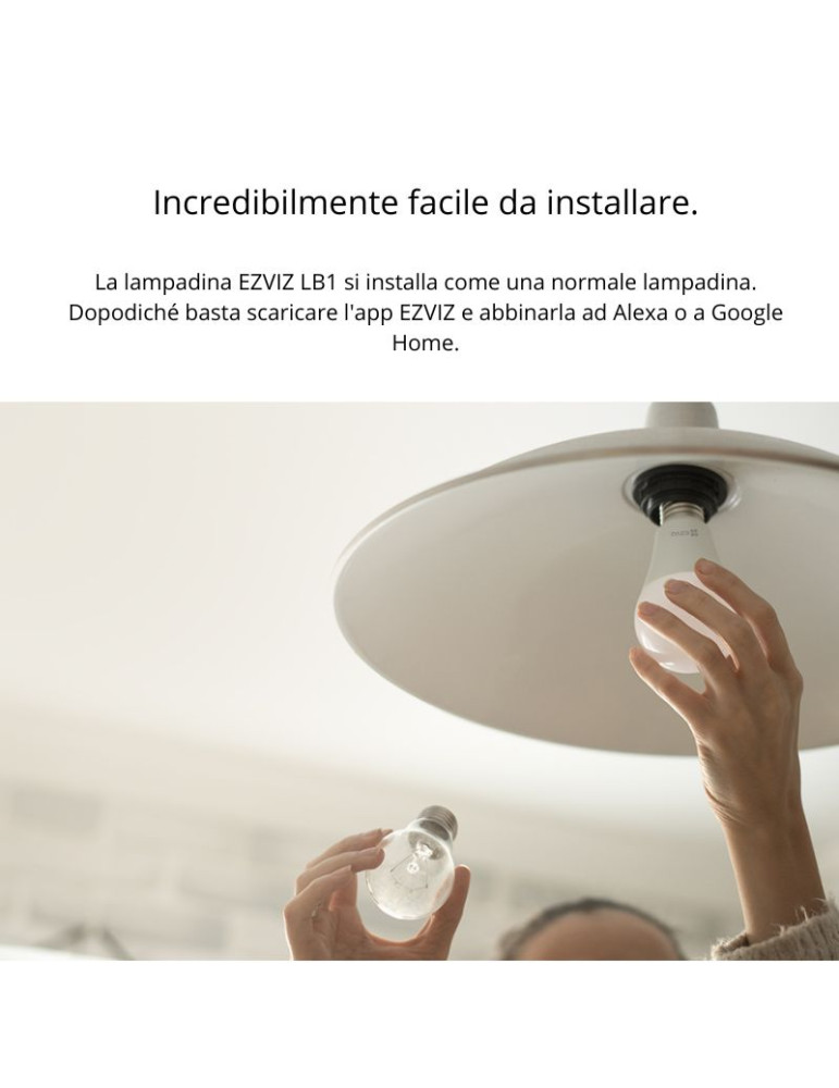Lampadina smart color. Le lampadine LB1-Color di EZVIZ sono compatibili con Alexa e con l'Assistente Google, quindi permettono di accendere e spegnere le luci, attenuarle o intensificarle, e addirittura modificare la temperatura di colore, il tutto mediante comandi vocali. L'app EZVIZ si può usare anche per programmare delle attività o controllare le luci di casa a distanza, ovunque ci si trovi. 120Lumen, 8W