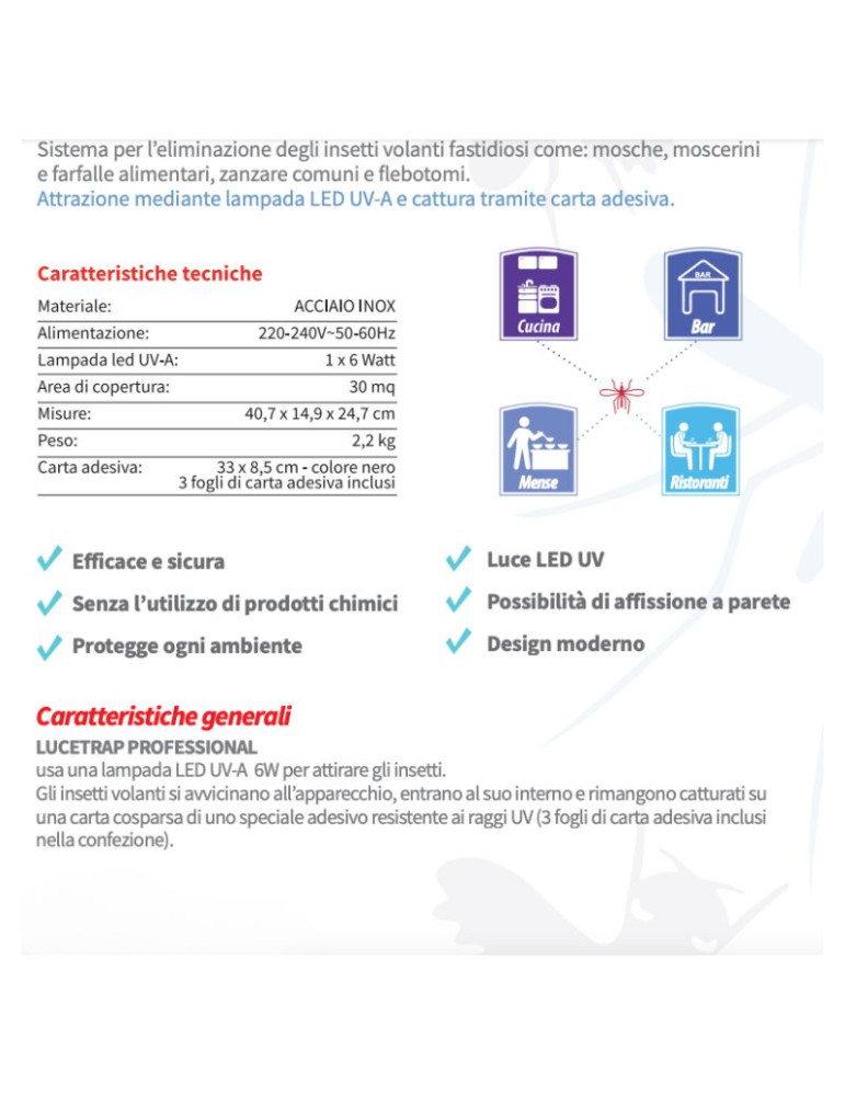 Apparecchio cattura insetti. LUCETRAP PROFESSIONAL . cattura gli insetti in ambienti pubblici e domestici senza l’uso di prodotti chimici. Rispetta la normativa HACCP e le direttive sanitarie.usa una lampada LED UV-A 6W per attirare gli insetti. Gli insetti volanti si avvicinano all’apparecchio, entrano al suo interno e rimangono catturati su una carta cosparsa di uno speciale adesivo resistente ai raggi UV (3 fogli di carta adesiva inclusi nella confezione)