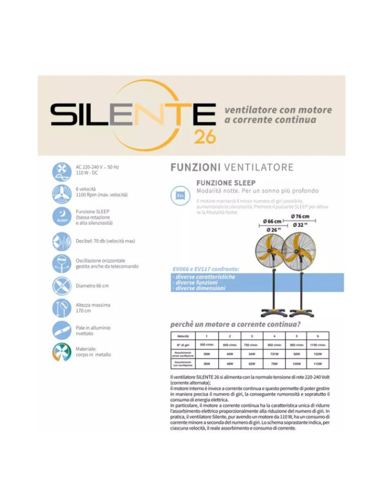 Il ventilatore SILENTE26 (dotato di telecomando) si alimenta con la normale tensione di rete 220-240 Volt (corrente alternata); il motore interno è invece a corrente continua e questo permette di poter gestire in maniera precisa il numero di giri, la conseguente rumorosità e soprattutto il consumo di energia elettrica. In particolare, il motore a corrente continua ha la caratteristica unica di ridurre l'assorbimento elettrico proporzionalmente alla riduzione del numero di giri.