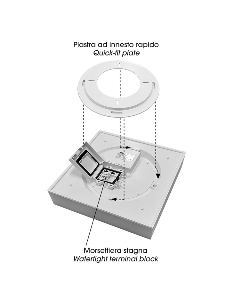 Plafoniera quadrata in policarbonato, IP54, ideale sia per esterni che per interni. Installazione semplificata con base separate e innesto a baionetta. Potenza selezionabile tramite l’apposito selettore _ CCT selezionabile. Trasforma l’atmosfera di ogni stanza con l’eleganza minimalista di questa plafoniera il cui design è caratterizzato da linee tese e spigoli vivi.