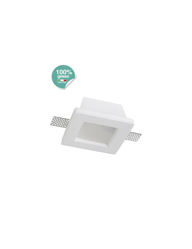 Faretto ad in casso completamente in gesso 100% , colore bianco. Adatto ad essere installato al soffitto. Portalampada GU10 compreso e schermo in vetro temperato satinato. IP20. Forma quadrata. Dimensioni 120 × 120 × 60 mm; foro 122x122mm. La confezione è priva di lampadina.